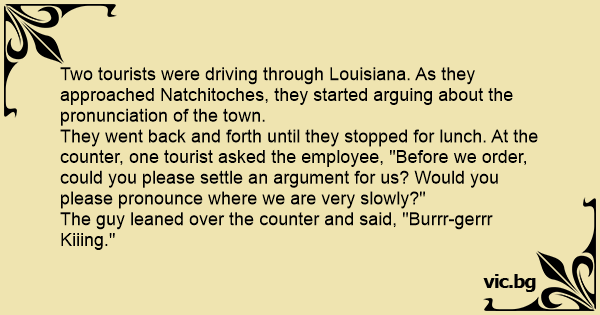 Two tourists were driving through Louisiana. As they approached Natchitoches, they started arguing about the pronunciation of the town.