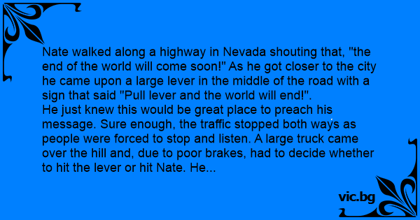 Nate walked along a highway in Nevada shouting that, "the end of the world will come soon!" As he got closer to the city he came upon a large lever in the middle of the road with a sign that said "Pull lever and the world will end!".