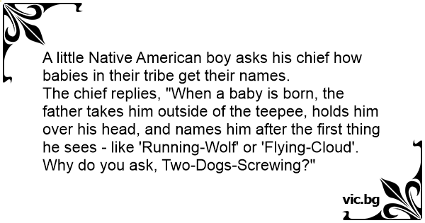 The chief replies, "When a baby is born, the father takes him outside of the teepee, holds him over his head, and names him after the first thing he sees - like 'Running-Wolf' or 'Flying-Cloud'. Why do you ask, Two-Dogs-Sсrеwing?"