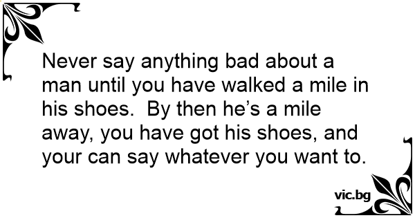 Never say anything bad about a man until you have walked a mile in his shoes. By then he’s a mile away, you have got his shoes, and your can say whatever you want to.