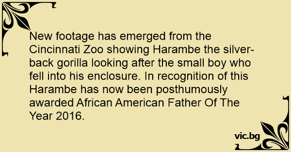 New footage has emerged from the Cincinnati Zoo showing Harambe the silver-back gorilla looking after the small boy who fell into his enclosure. In recognition of this Harambe has now been posthumously awarded African American Father Of The Year 2016.