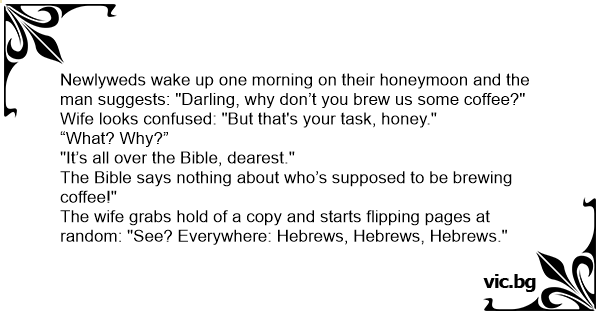 Newlyweds wake up one morning on their honeymoon and the man suggests: "Darling, why don’t you brew us some coffee?"
