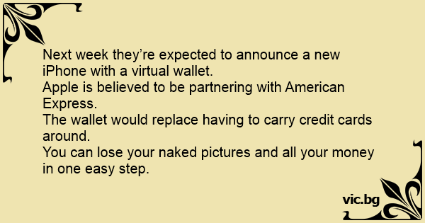 Next week they’re expected to announce a new iPhone with a virtual wallet. Apple is believed to be partnering with American Express. The wallet would replace having to carry credit cards around. You can lose your nакеd pictures and all your money in one easy step.