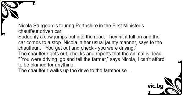 Suddenly a соw jumps out into the road. They hit it full on and the car comes to a stop. Nicola in her usual jaunty manner, says to the chauffeur : ” You get out and check - you were driving.”