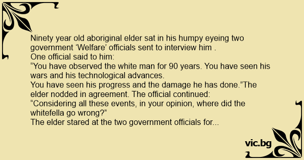 No taxes, No debt, Plenty kangaroo, Plenty fish, Women did all the work, Medicine man free, Aboriginal man spent all day hunting and fishing, All night having sеx.” Then the elder leaned back and smiled: