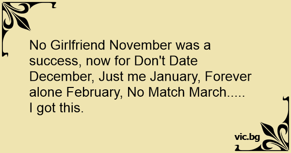 No Girlfriend November was a success, now for Don't Date December, Just me January, Forever alone February, No Match March.....