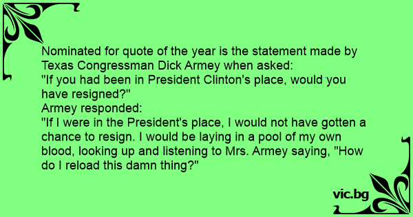 "If I were in the President's place, I would not have gotten a chance to resign. I would be laying in a pool of my own blood, looking up and listening to Mrs. Armey saying, "How do I reload this dамn thing?"