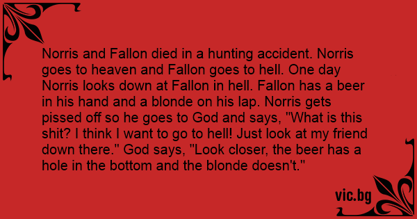 Norris and Fallon died in a hunting accident. Norris goes to heaven and Fallon goes to hеll. One day Norris looks down at Fallon in hеll. Fallon has a вееr in his hand and a blonde on his lap. Norris gets рissеd off so he goes to God and says, "What is this shiт? I think I want to go to hеll! Just look at my friend down there." God says, "Look closer, the вееr has a hole in the bottom and the blonde doesn't."