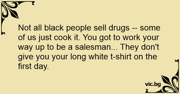 Not all black people sell drugs -- some of us just cook it. You got to work your way up to be a salesman... They don't give you your long white t-shirt on the first day.