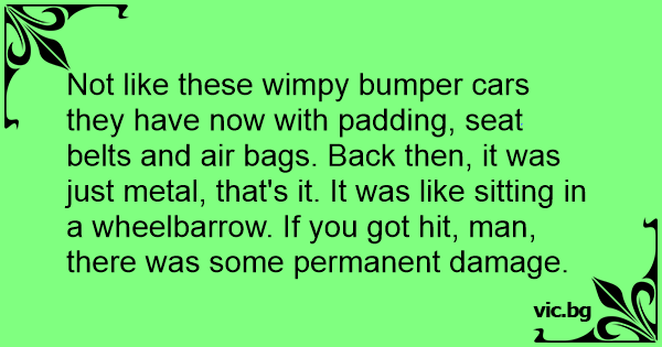 Not like these wimpy bumper cars they have now with padding, seat belts and air bags. Back then, it was just metal, that's it. It was like sitting in a wheelbarrow. If you got hit, man, there was some permanent damage.