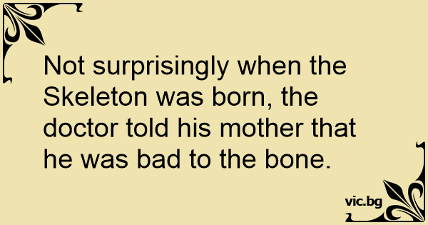 Not surprisingly when the Skeleton was born, the doctor told his mother that he was bad to the воnе. 1 0 0 Skeleton jokes