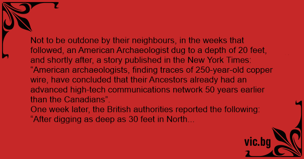 “American archaeologists, finding traces of 250-year-old copper wire, have concluded that their Ancestors already had an advanced high-tech communications network 50 years earlier than the Canadians”.