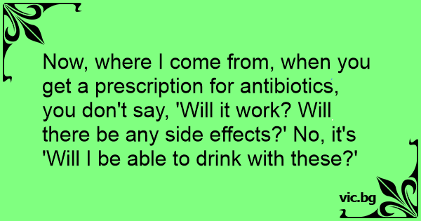 Now, where I come from, when you get a prescription for antibiotics, you don't say, 'Will it work? Will there be any side effects?' No, it's 'Will I be able to drink with these?'