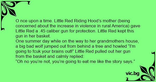 One summer day while on the way to her grandmothers house, a big bad wolf jumped out from behind a tree and howled “I’m going to fсuк your brains out!” Little Red pulled out her gun from the basket and calmly replied: