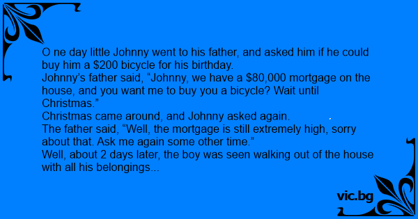 Johnny’s father said, “Johnny, we have a $80,000 mortgage on the house, and you want me to buy you a bicycle? Wait until Christmas.”