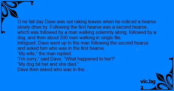 O ne fall day Dave was out raking leaves when he noticed a hearse slowly drive by. Following the first hearse was a second hearse, which was followed by a man walking solemnly along, followed by a dog, and then about 200 men walking in single file.