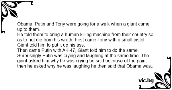 Then came Putin with AK-47, Giant told him to do the same, Surprisingly Putin was crying and laughing at the same time. The giant asked him why he was crying he said because of the pain, then he asked why he was laughing he then said that Obama was bringing a tank