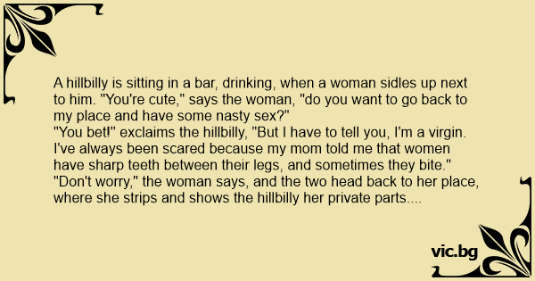"You bet!'' exclaims the hillbilly, "But I have to tell you, I'm a virgin. I've always been scared because my mom told me that women have sharp teeth between their legs, and sometimes they bite."