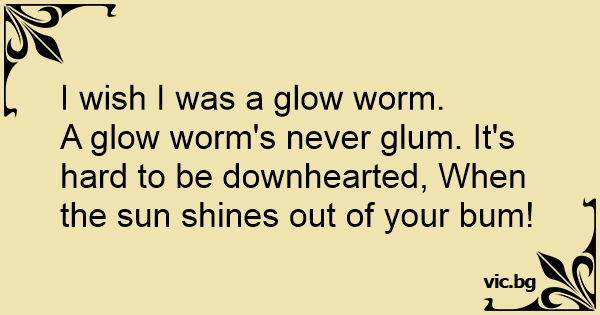 A glow worm's never glum. It's hard to be downhearted, When the sun shines out of your вuм!