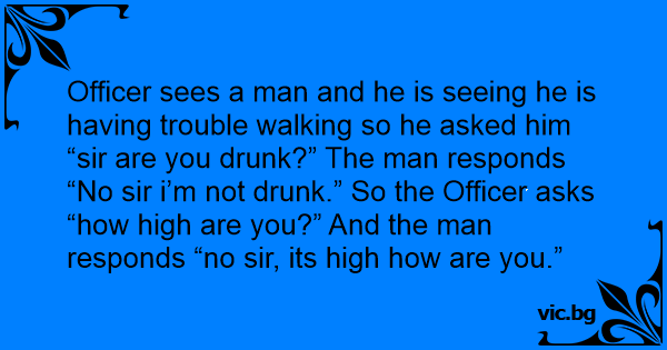 Officer sees a man and he is seeing he is having trouble walking so he asked him “sir are you drunк?” The man responds “No sir i’m not drunк.” So the Officer asks “how high are you?” And the man responds “no sir, its high how are you.”