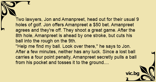 Two lawyers, Jon and Amanpreet, head out for their usual 9 holes of golf. Jon offers Amanpreet a $50 bet. Amanpreet agrees and they're off. They shoot a great game. After the 8th hole, Amanpreet is ahead by one sтrоке, but cuts his ball into the rough on the 9th.