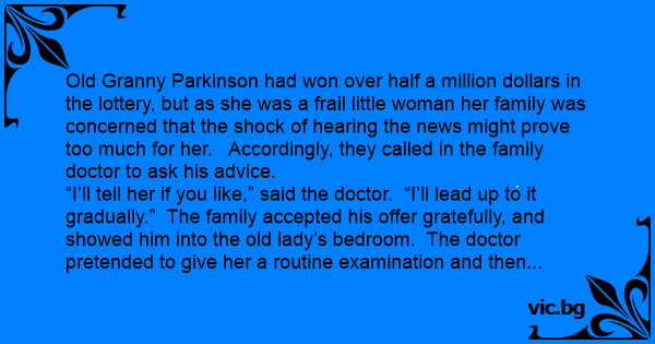 Old Granny Parkinson had won over half a million dollars in the lottery, but as she was a frail little woman her family was concerned that the shock of hearing the news might prove too much for her. Accordingly, they called in the family doctor to ask his advice.