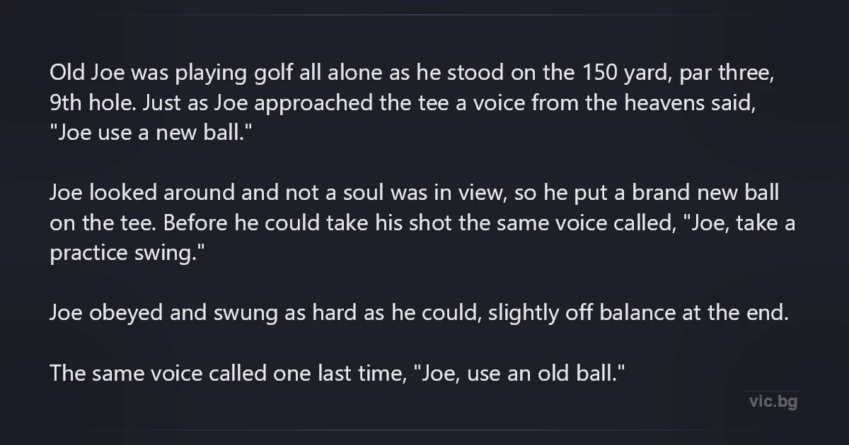 Joe looked around and not a soul was in view, so he put a brand new ball on the tee. Before he could take his shot the same voice called, "Joe, take a practice swing."