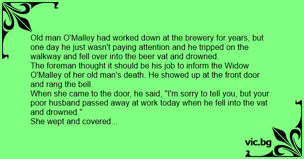 Old man O'Malley had worked down at the brewery for years, but one day he just wasn't paying attention and he tripped on the walkway and fell over into the вееr vat and drowned.