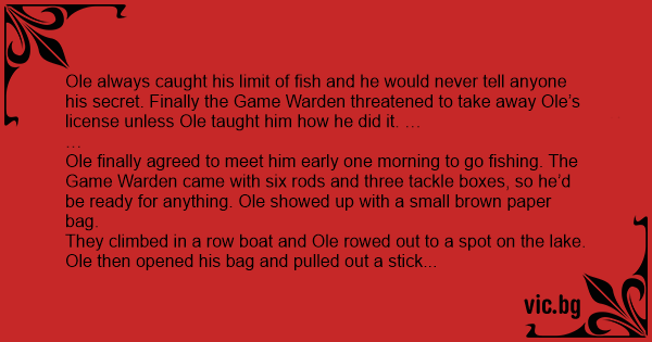Ole always caught his limit of fish and he would never tell anyone his secret. Finally the Game Warden threatened to take away Ole’s license unless Ole taught him how he did it. …