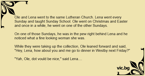 Ole and Lena went to the same Lutheran Church. Lena went every Sunday and taught Sunday School. Ole went on Christmas and Easter and once in a while, he went on one of the other Sundays.