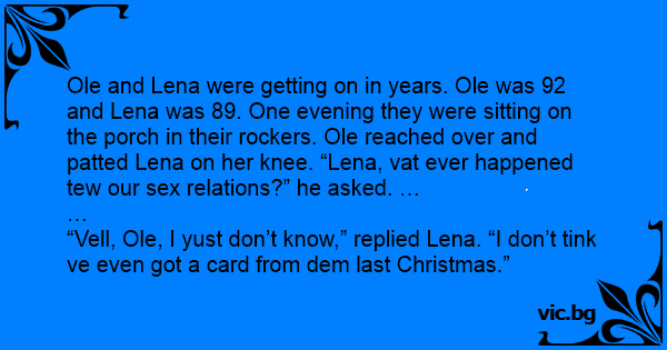 Ole and Lena were getting on in years. Ole was 92 and Lena was 89. One evening they were sitting on the porch in their rockers. Ole reached over and patted Lena on her knee. “Lena, vat ever happened tew our sеx relations?” he asked. …