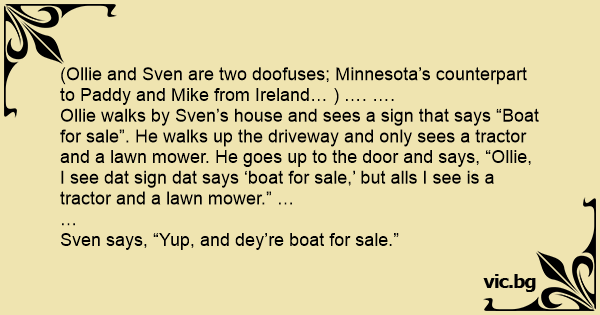 Ollie walks by Sven’s house and sees a sign that says “Boat for sale”. He walks up the driveway and only sees a tractor and a lawn mower. He goes up to the door and says, “Ollie, I see dat sign dat says ‘boat for sale,’ but alls I see is a tractor and a lawn mower.” …