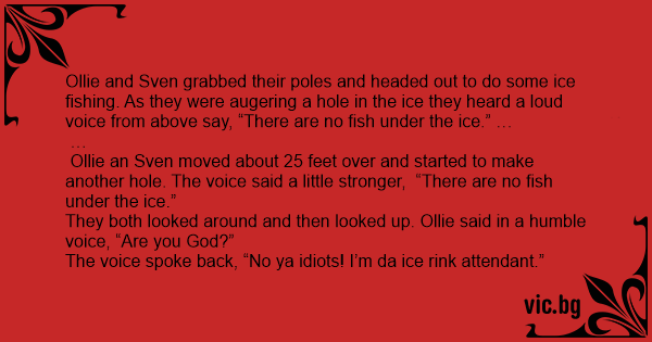 Ollie and Sven grabbed their poles and headed out to do some ice fishing. As they were augering a hole in the ice they heard a loud voice from above say, “There are no fish under the ice.” … … Ollie an Sven moved about 25 feet over and started to make another hole. The voice said a little stronger, “There are no fish under the ice.” They both looked around and then looked up. Ollie said in a humble voice, “Are you God?” The voice spoke back, “No ya idiots! I’m da ice rink attendant.”