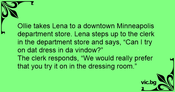Ollie takes Lena to a downtown Minneapolis department store. Lena steps up to the clerk in the department store and says, “Can I try on dat dress in da vindow?”