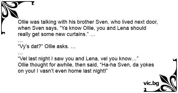 Ollie was talking with his brother Sven, who lived next door, when Sven says, “Ya know Ollie, you and Lena should really get some new curtains.” …