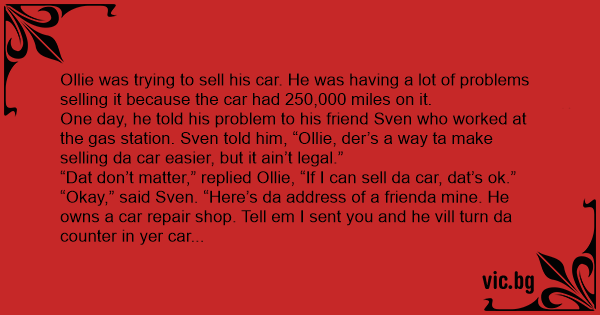 “Okay,” said Sven. “Here’s da address of a frienda mine. He owns a car repair shop. Tell em I sent you and he vill turn da counter in yer car back ta 50,000 miles. Den it von’t be a problem ta sell yer car anymore.”
