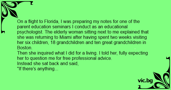On a flight to Florida, I was preparing my notes for one of the parent education seminars I conduct as an educational psychologist. The elderly woman sitting next to me explained that she was returning to Miami after having spent two weeks visiting her six children, 18 grandchildren and ten great grandchildren in Boston.