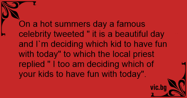 On a hot summers day a famous celebrity tweeted " it is a beautiful day and I`m deciding which kid to have fun with today" to which the local priest replied " I too am deciding which of your kids to have fun with today".