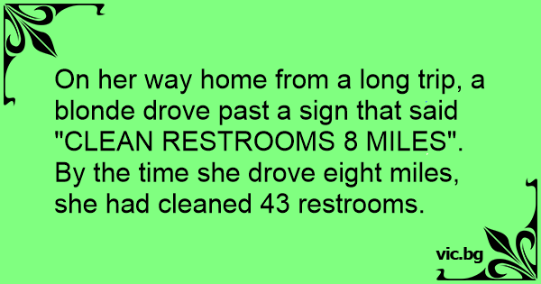 On her way home from a long trip, a blonde drove past a sign that said "CLEAN RESTROOMS 8 MILES". By the time she drove eight miles, she had cleaned 43 restrooms.