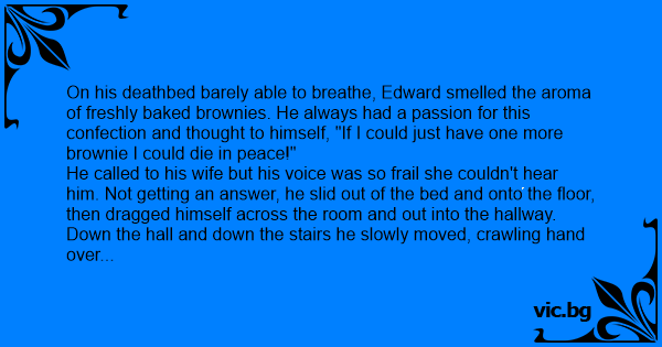 On his deathbed barely able to breathe, Edward smelled the aroma of freshly baked brownies. He always had a passion for this confection and thought to himself, "If I could just have one more brownie I could die in peace!"