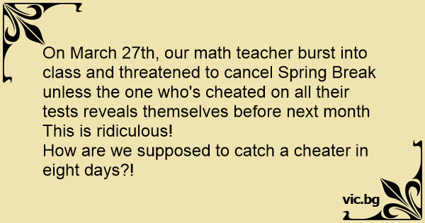 On March 27th, our math teacher burst into class and threatened to cancel Spring Break unless the one who's cheated on all their tests reveals themselves before next month