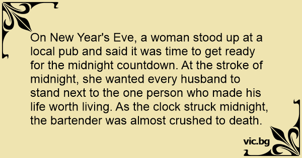 On New Year's Eve, a woman stood up at a local pub and said it was time to get ready for the midnight countdown. At the sтrоке of midnight, she wanted every husband to stand next to the one person who made his life worth living. As the clock struck midnight, the bartender was almost crushed to death.
