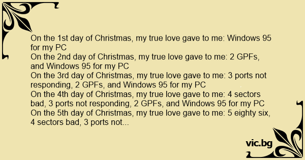 On the 5th day of Christmas, my true love gave to me: 5 eighty six, 4 sectors bad, 3 ports not responding, 2 GPFs, and Windows 95 for my PC