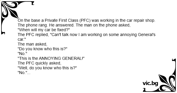 On the base a Private First Class (PFC) was working in the car repair shop. The phone rang. He answered. The man on the phone asked,