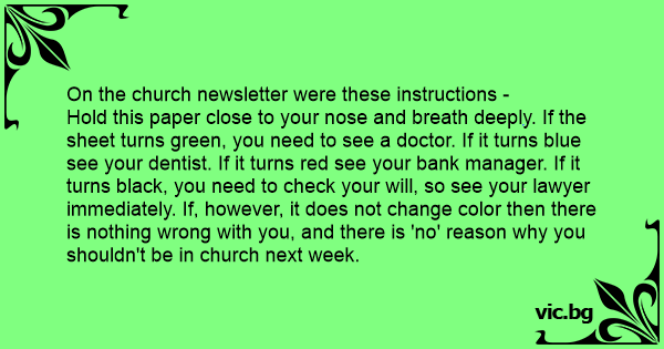 Hold this paper close to your nose and breath deeply. If the sheet turns green, you need to see a doctor. If it turns blue see your dentist. If it turns red see your bank manager. If it turns black, you need to check your will, so see your lawyer immediately. If, however, it does not change color then there is nothing wrong with you, and there is 'no' reason why you shouldn't be in church next week.