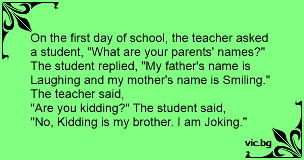 On the first day of school, the teacher asked a student, "What are your parents' names?" The student replied, "My father's name is Laughing and my mother's name is Smiling." The teacher said,