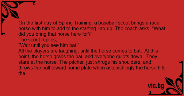 All the players are laughing, until the horse comes to bat. At this point, the horse grabs the bat, and everyone quiets down. They stare at the horse. The pitcher, just shrugs his shoulders, and throws the ball toward home plate when astonishingly the horse hits the ball deep in the outfield.
