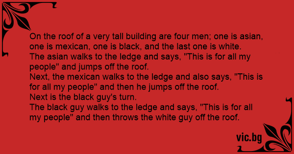 The asian walks to the ledge and says, "This is for all my people" and jumps off the roof.