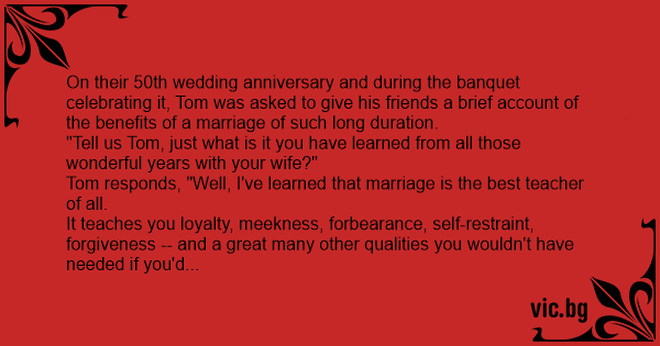 On their 50th wedding anniversary and during the banquet celebrating it, Tom was asked to give his friends a brief account of the benefits of a marriage of such long duration.
