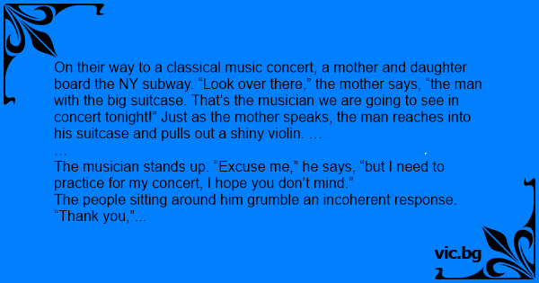 On their way to a classical music concert, a mother and daughter board the NY subway. “Look over there,” the mother says, “the man with the big suitcase. That’s the musician we are going to see in concert tonight!” Just as the mother speaks, the man reaches into his suitcase and pulls out a shiny violin. …
